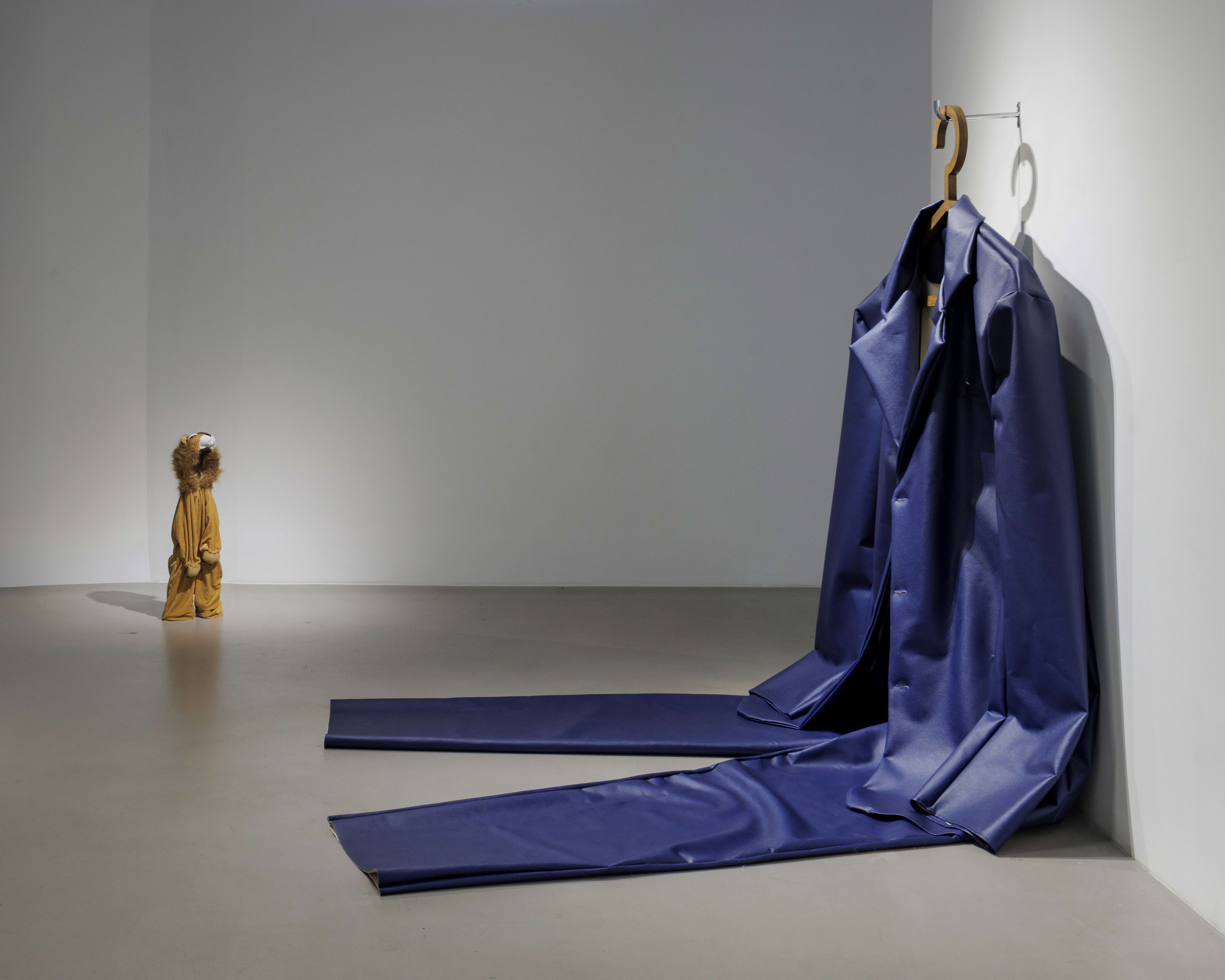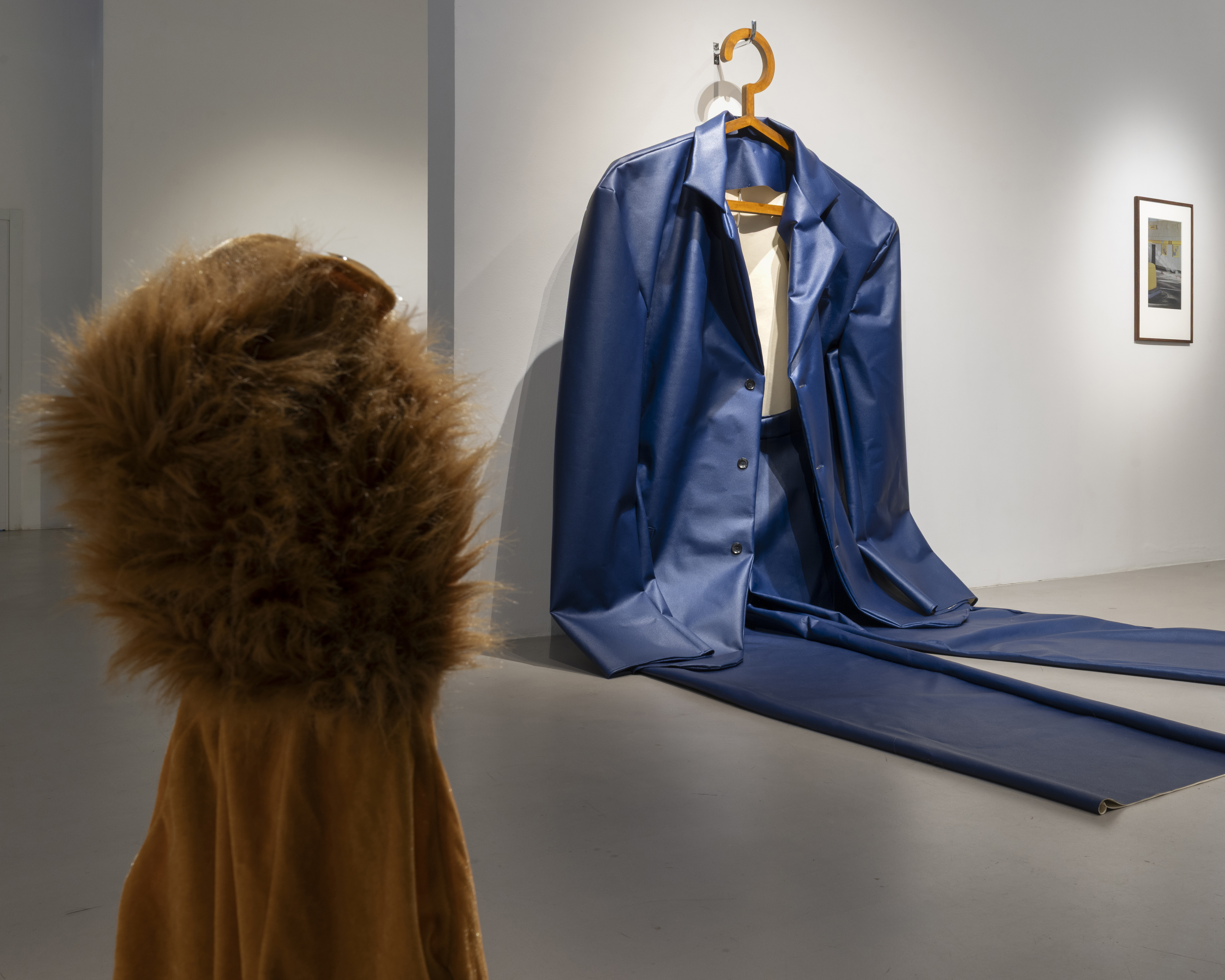 Politician is an oversized suit made of dark blue linoleum. The garment is sewn from a material familiar from floor tiles and public spaces: industrial, durable, inexpensive, and never meant to touch the body. Its use replaces the softness and flexibility of fabric with a rigid, glossy surface that simulates presence while simultaneously erasing it.