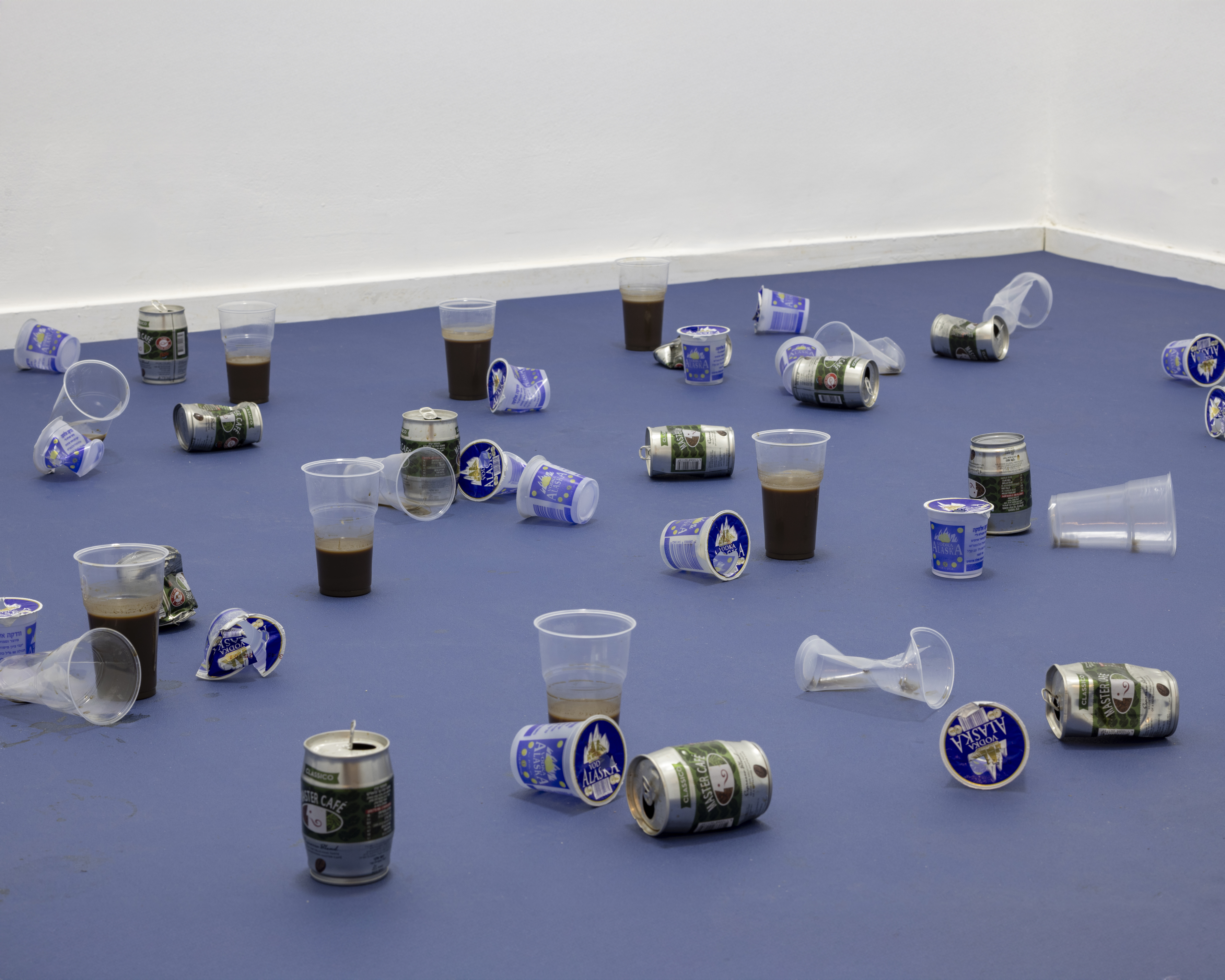 Plastic cups of “Alaska” vodka and “Master Café” cans scattered across a blue linoleum floor a reflection on the gap between image and reality, between fantasy and the urban everyday of exhaustion, survival, and an imagined sense of style.